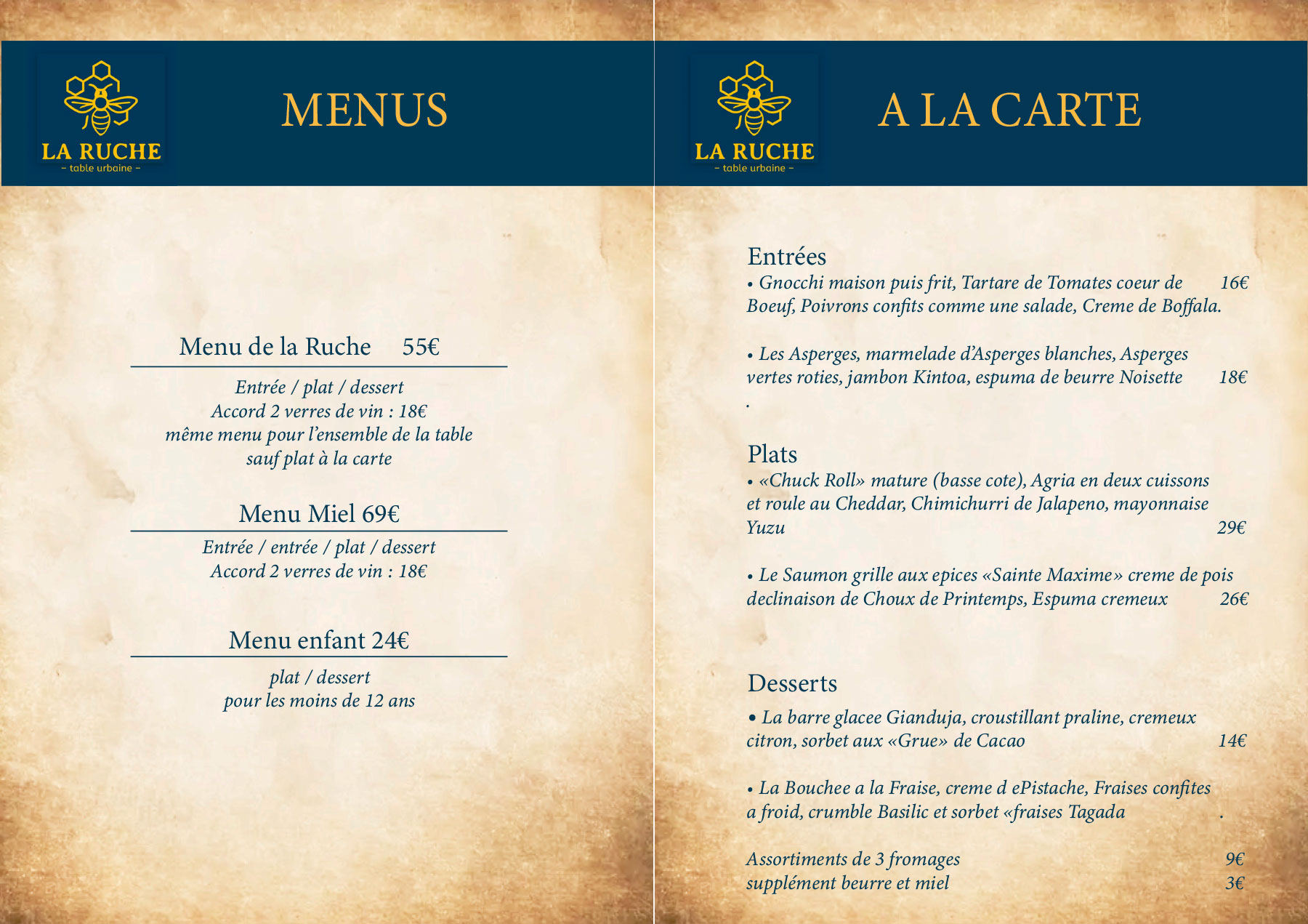 Dans notre cuisine, le chef Pierre STOCKY rafine certains plats d’une douceur délicate et d’une richesse aromatique unique. Le miel et ses dérivés sont utilisés avec justesse, ils équilibrent les saveurs et apporte une touche de magie à certains plats.